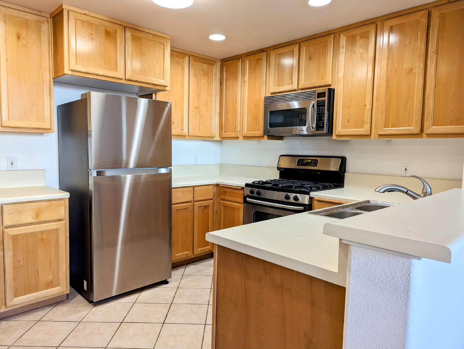 Kitchen has lots of storage space and stainless appliances including fridge for tenant use.