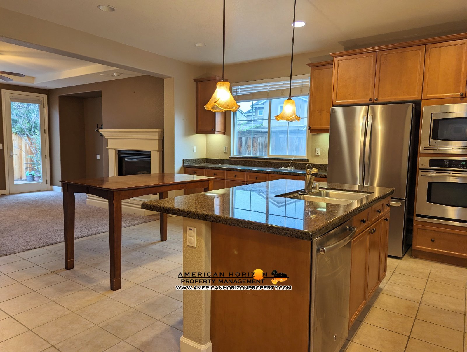 Kitchen featuring granite counters, island, tons of cabinet storage, fridge for tenant use, gas cooktop and wall oven plus a Butler's pantry. Family room off kitchen has gas fireplace and access out to backyard.
