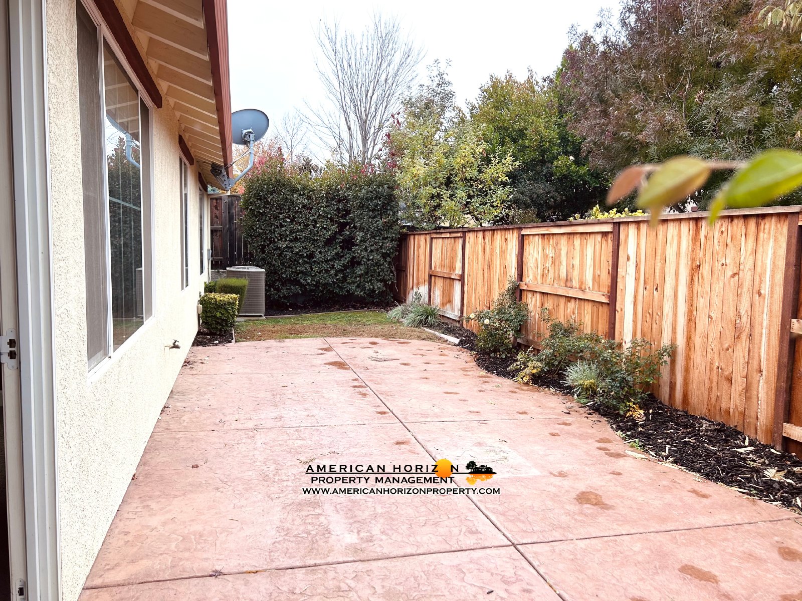 Low-maintenance backyard has large stained concrete patio and small grass area.