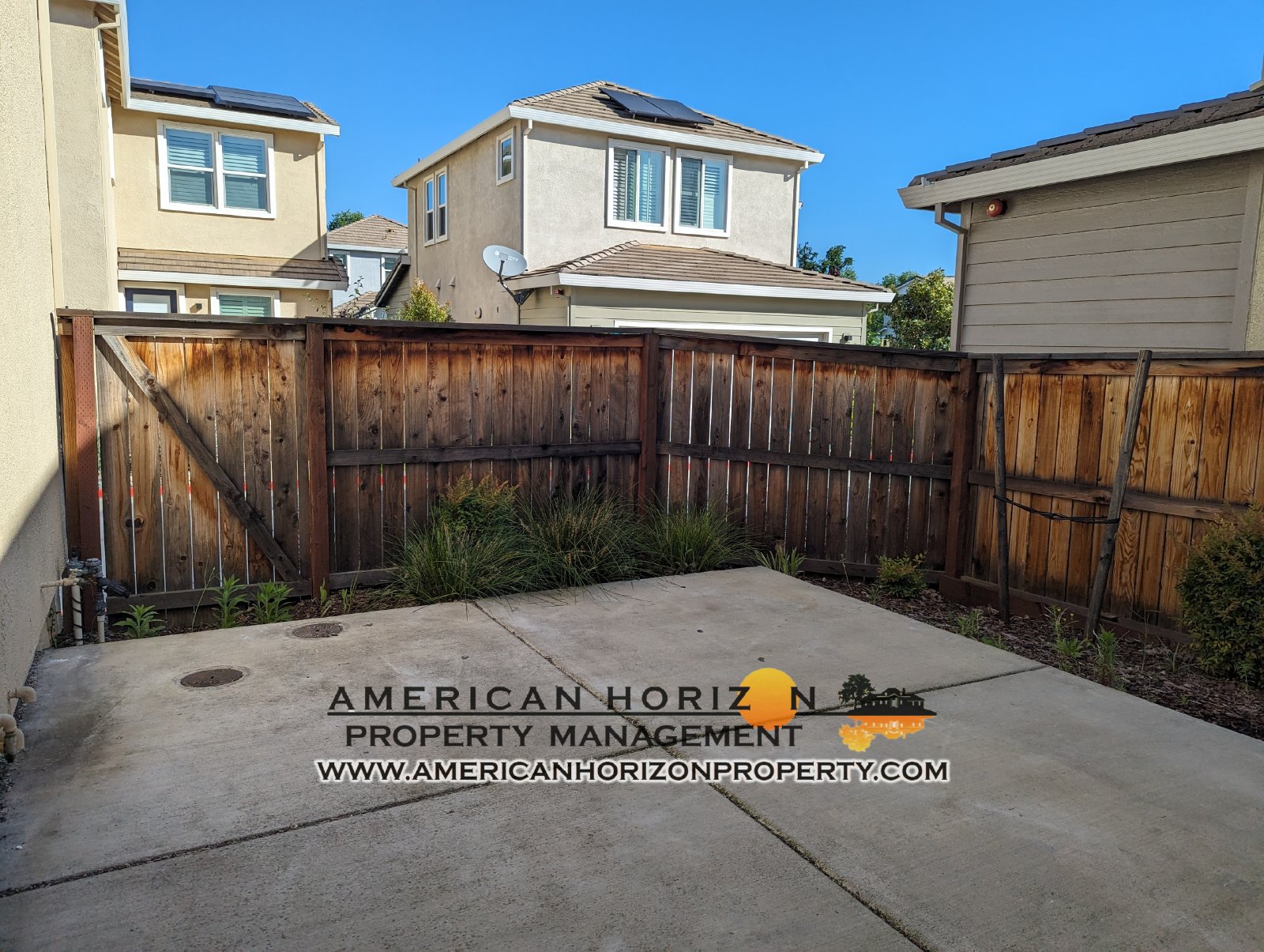 Backyard patio fenced off with plenty of room for table and chairs.