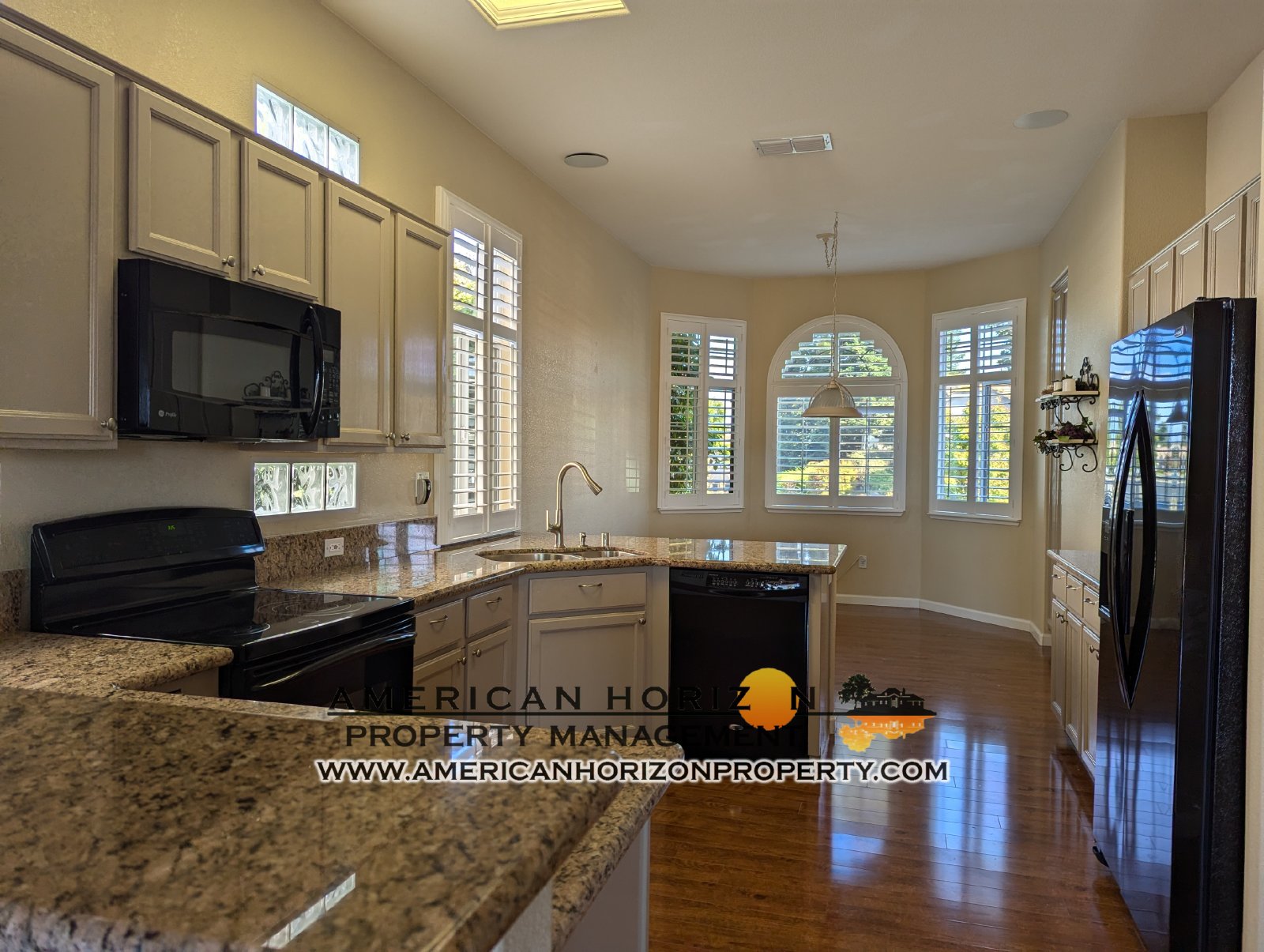 Kitchen is light & bright featuring granite counters and black appliances.